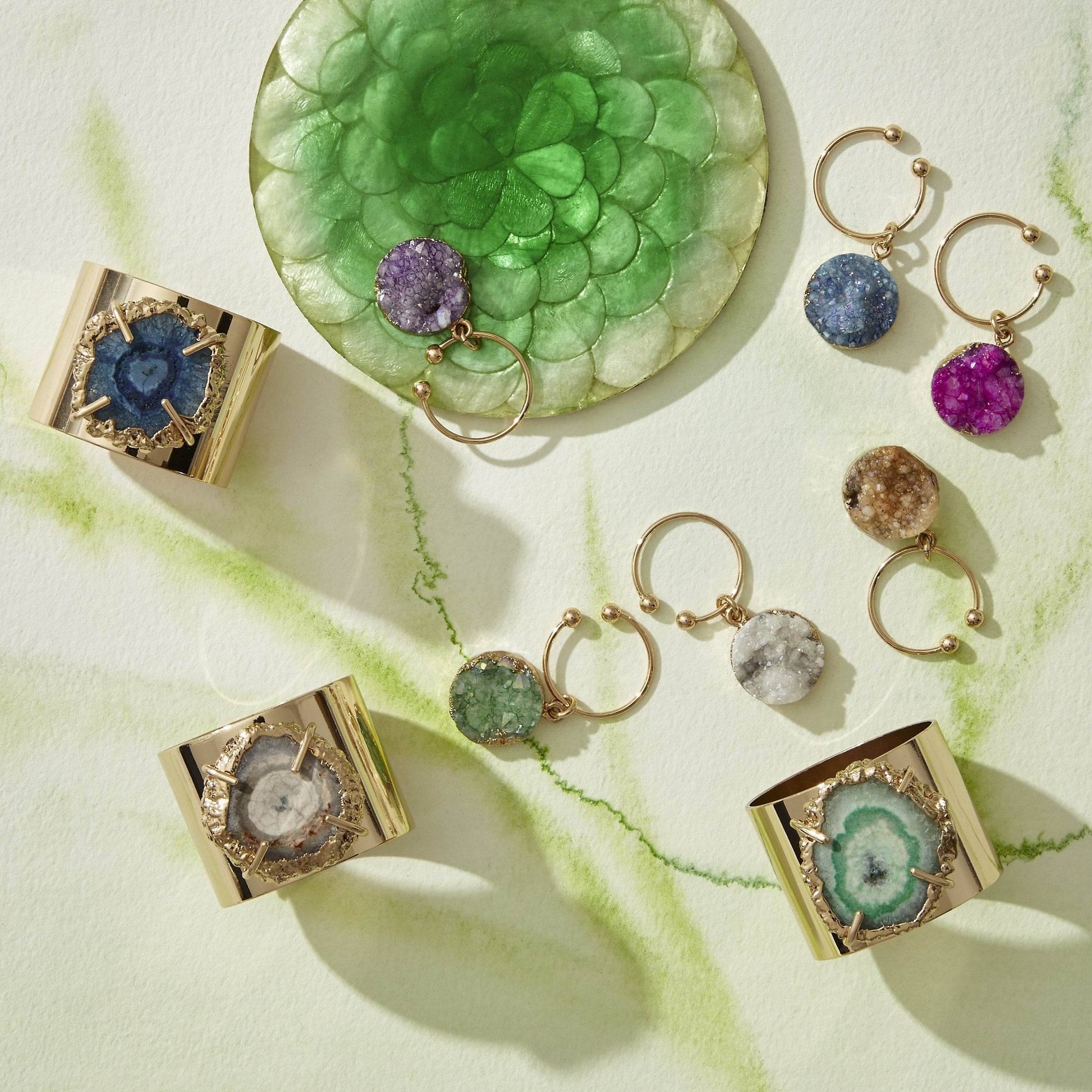 These beautiful quartz pieces on these napkin rings are all totally unique. We electroplated the edges of the stones in gold to really pop the colour... and they could not be more fabulous! I love them paired with a tonal napkin, to me, it really brings out the colour of the stone.